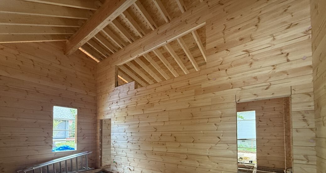 全ログ材で組まれた建物にとって、**木材の収縮(沈み込み)**への対応は非常に重要です。そのため、屋根をログの壁に完全固定してしまうと、ログが沈む際に構造に負荷がかかってしまいます。
