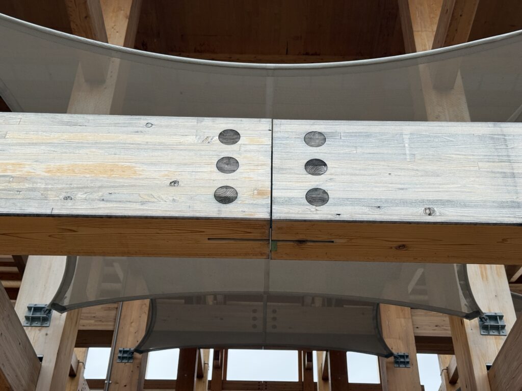 大屋根リングの使用木材は、スギ、ヒノキ、ヨーロッパ(オウシュウ)アカマツの集成材。釘は使用されていませんが、接着剤、金物が使用されています。