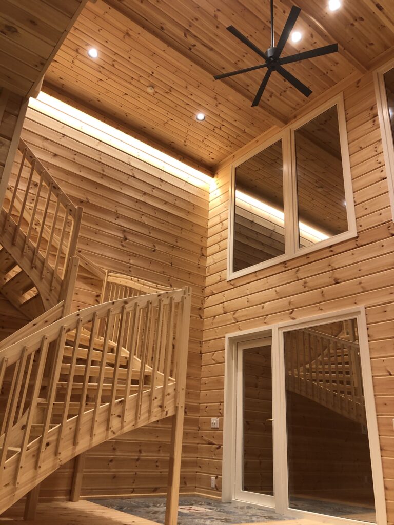 吹抜け上部FIX窓の室内から屋外に直線で突き抜けるライティングプラン