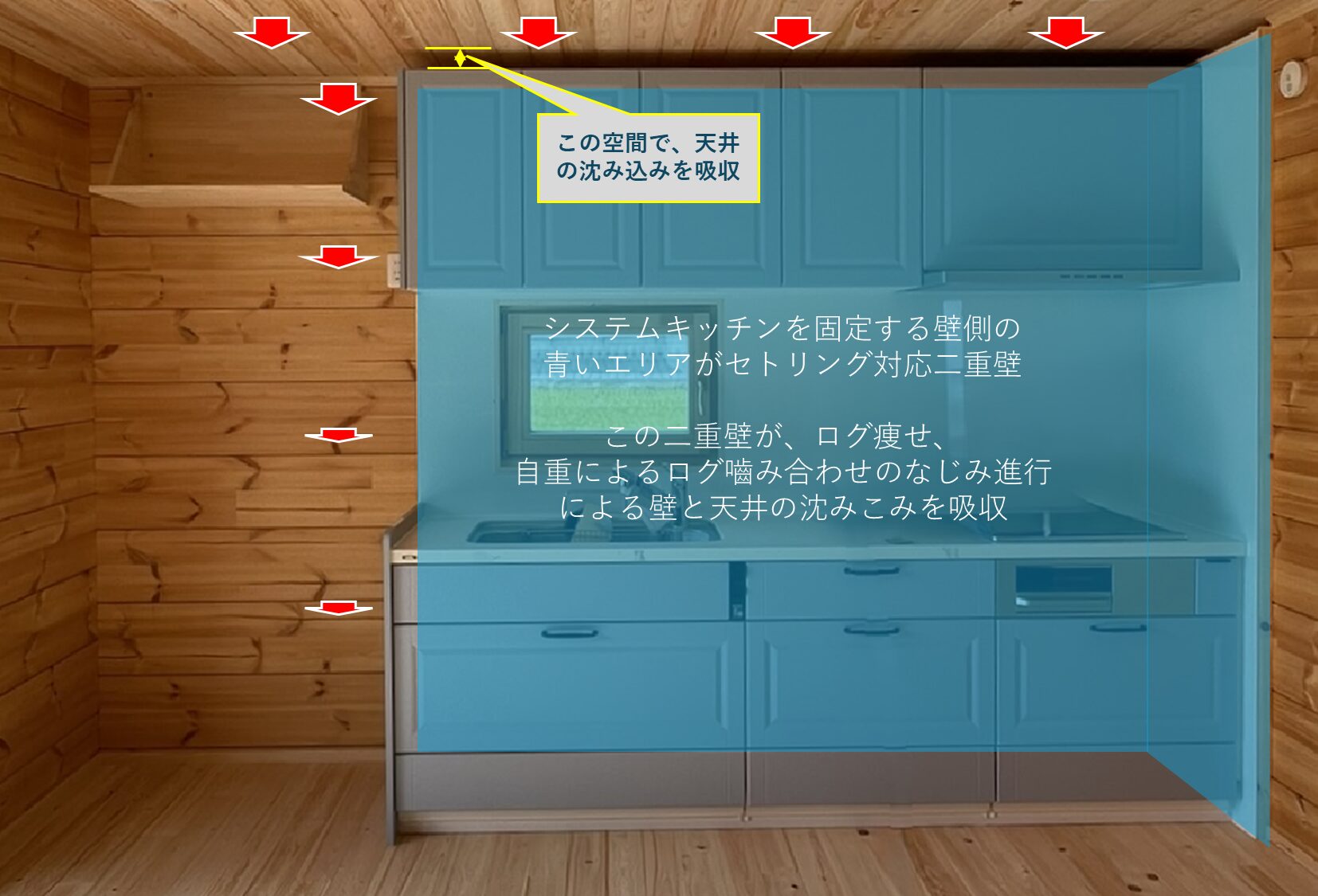 このような設備の施工には、ご承知のようにログハウス特有のセトリング対策を施す必要のある場合があります。下記キッチンの例のように壁や天井が下がってきますので、つぶされ無いように対策をします。