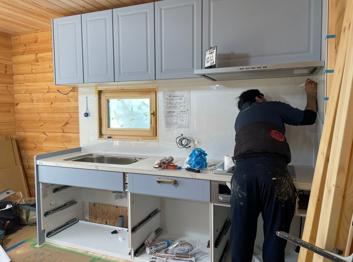 さて京都府のログハウスも内装が終了し、キッチン、浴室、洗面、洗濯防水パン、トイレ、エコキュートなど次々と設備の設置が行われています。