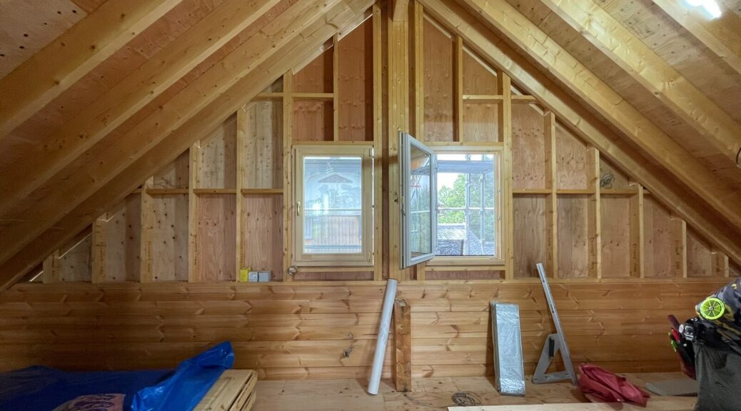 ログハウスの新築の工程も佳境に入り、日々大工さん・電気屋さん・設備屋さんが来られて設備、内装をどんどん進めていってらっしゃいます。