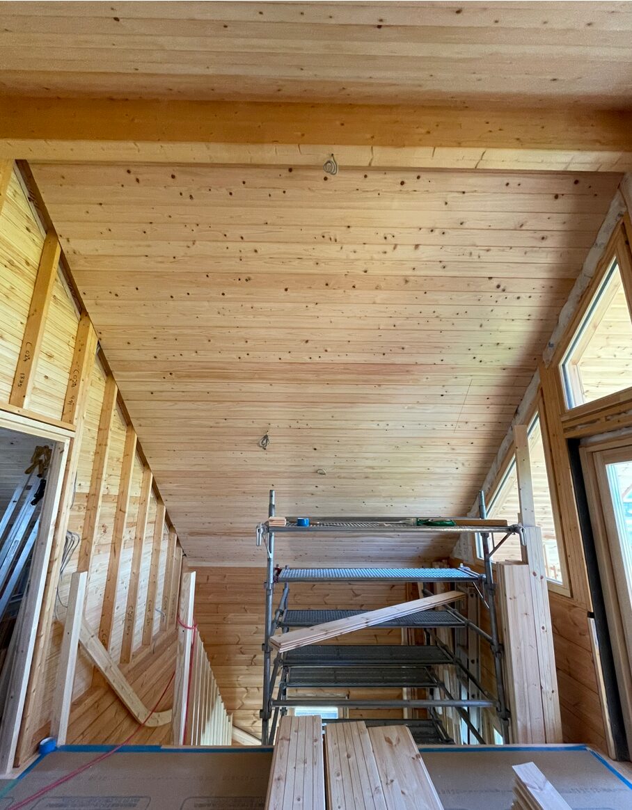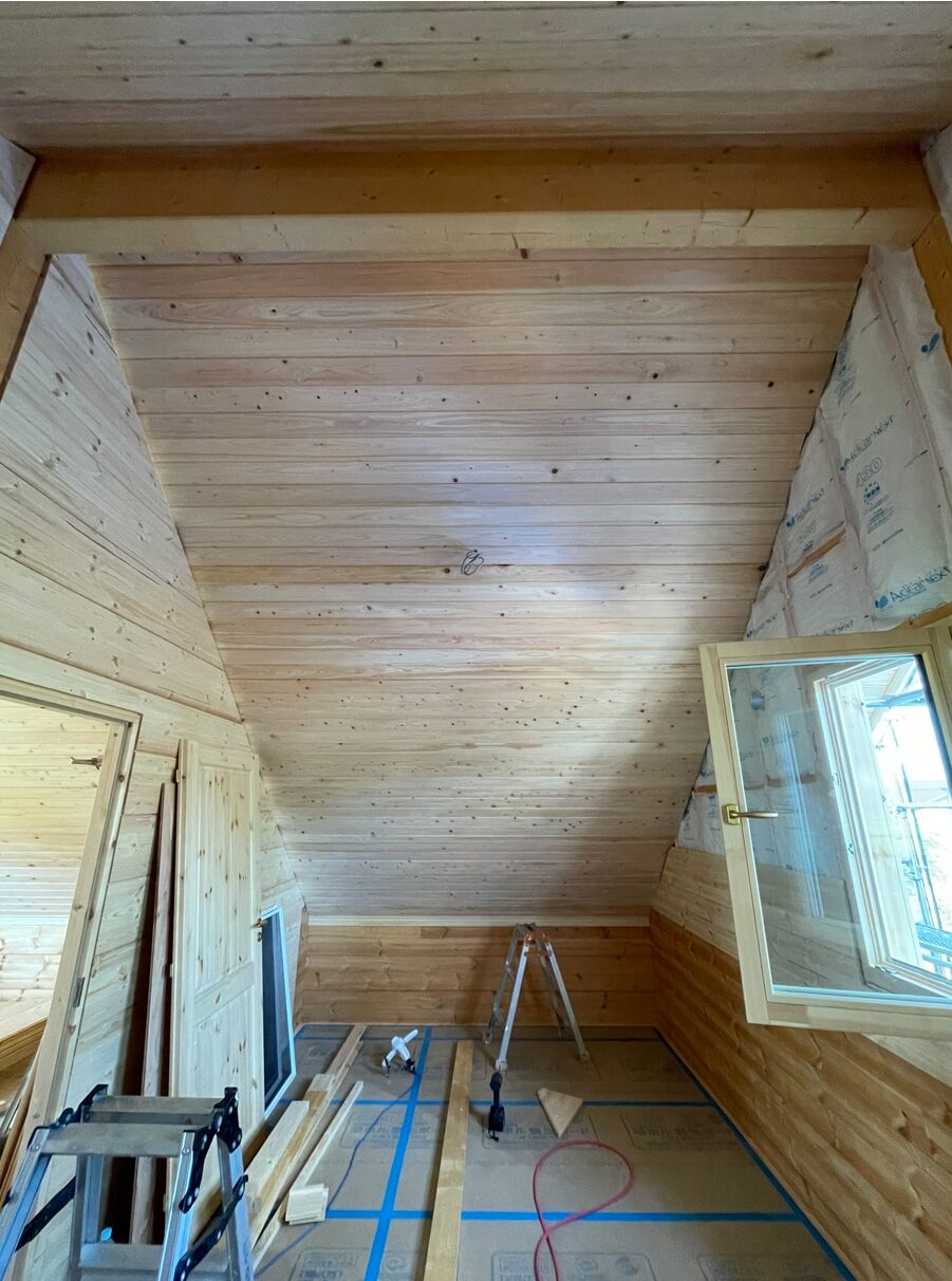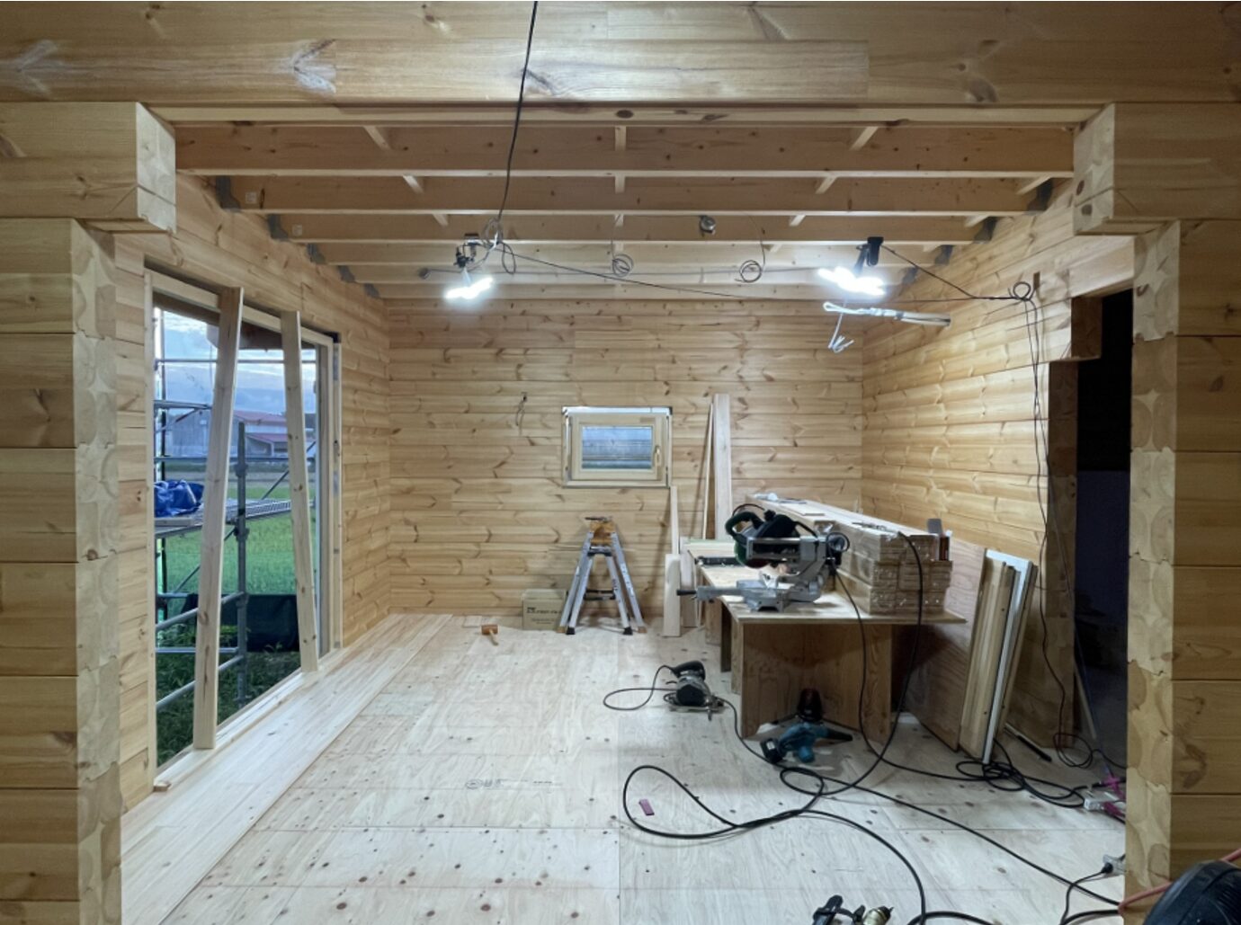 まずは天井と床の化粧板貼りです。こちらのログハウスでは、天井・床共にひのきを採用いただきました。ひのきの無垢板で天井も床も貼っていくと、ひのきのいい香りが部屋中に香ります。