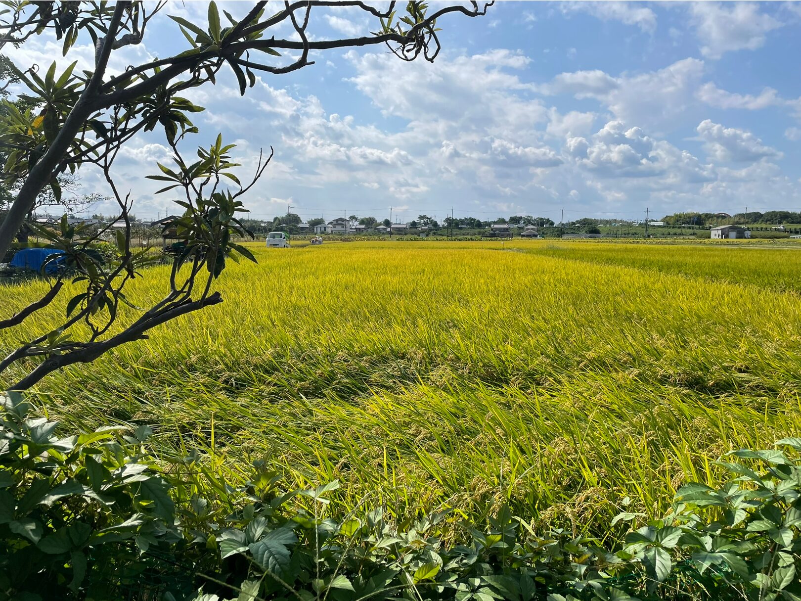 あたりの田んぼはすでに刈り取られていますが、ちょうど内装をやっているころのログハウスの目の前美しい田園風景の写真がありましたので掲載します。