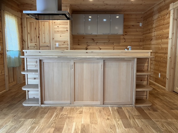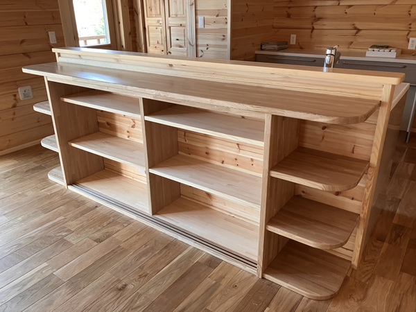 これは、キッチンカウンター前の収納棚。造作で扉も作りました(^_-)-☆